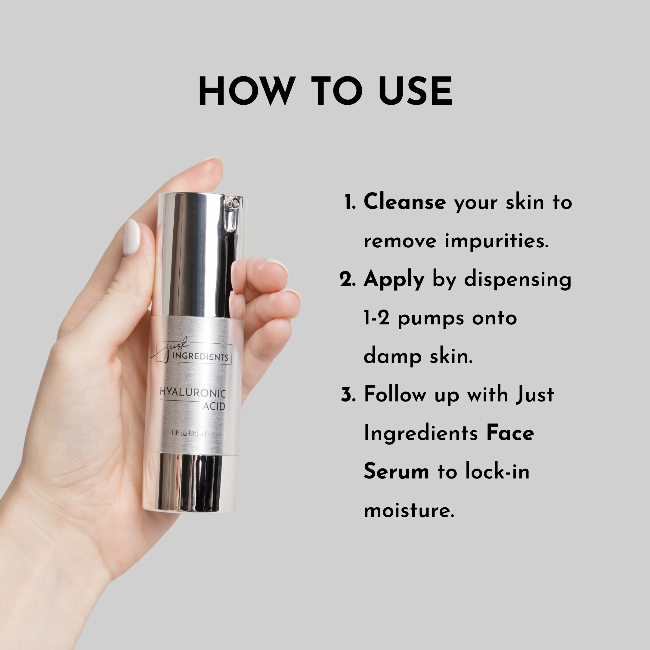 20ppm SilverSol® (deionized water and purified silver), Hyaluronic Acid (2%), Organic Vegetable Glycerin